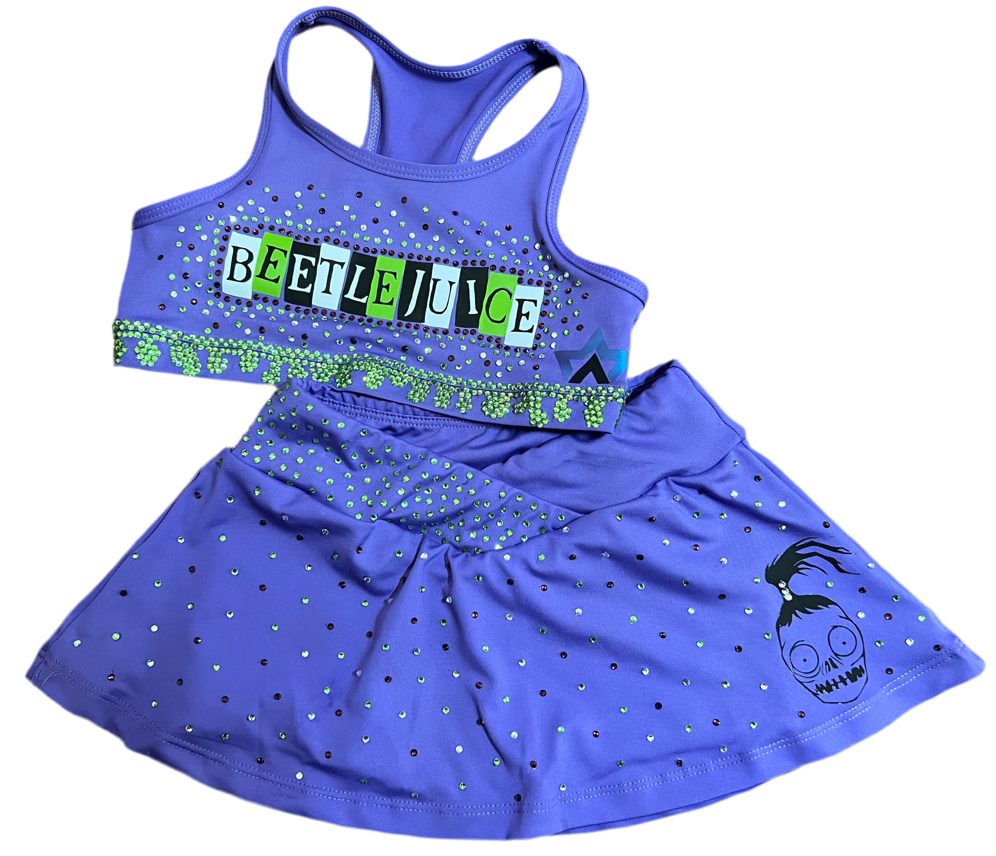 Step into spooky-cute style with our Beetlejuice Practice Set! Perfect for cheer, dance, or just serving fierce vibes at practice, this set is inspired by bold black-and-white stripes with a pop of neon green Beetlejuice energy.